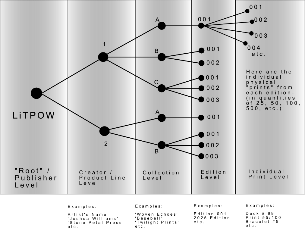 Each level is connected through transactions on the Bitcoin ledger. Each item can be verified as authentic, because its record traces back through the Edition, the Collection, the Creator, and finally the Root.